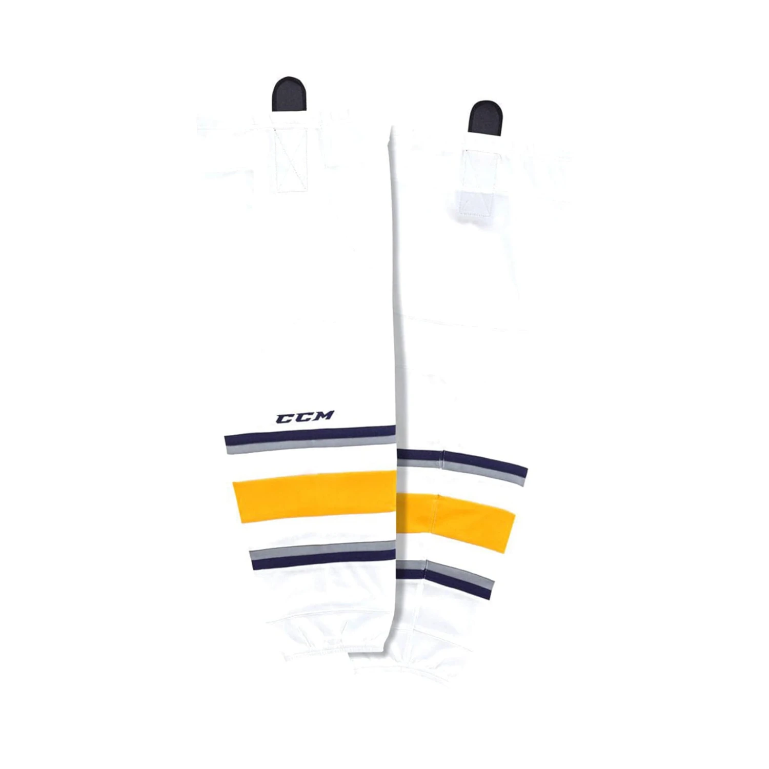 The Buffalo Sabres CCM Quicklite 8000 game socks have been designed for NHL standards. Their ergonomic fit helps move with the player to maximize mobility while staying snug. The socks are made of a 200gsm (gram per square meter) high performance, and breathable QLT knit polyester which maintains its shape and enhances snag resistance.