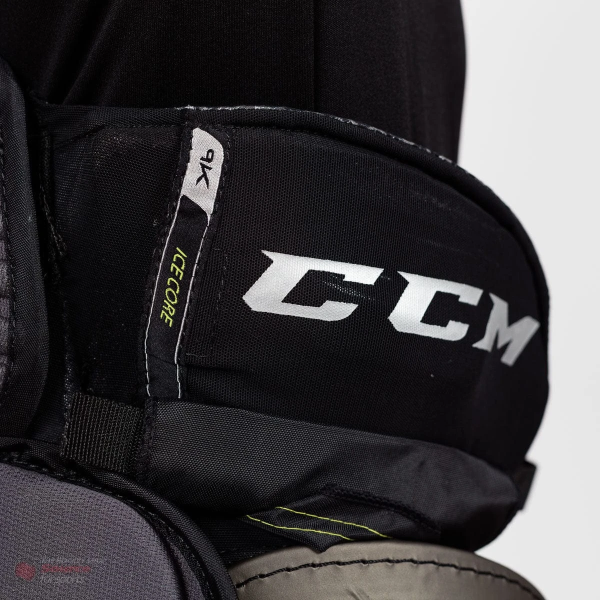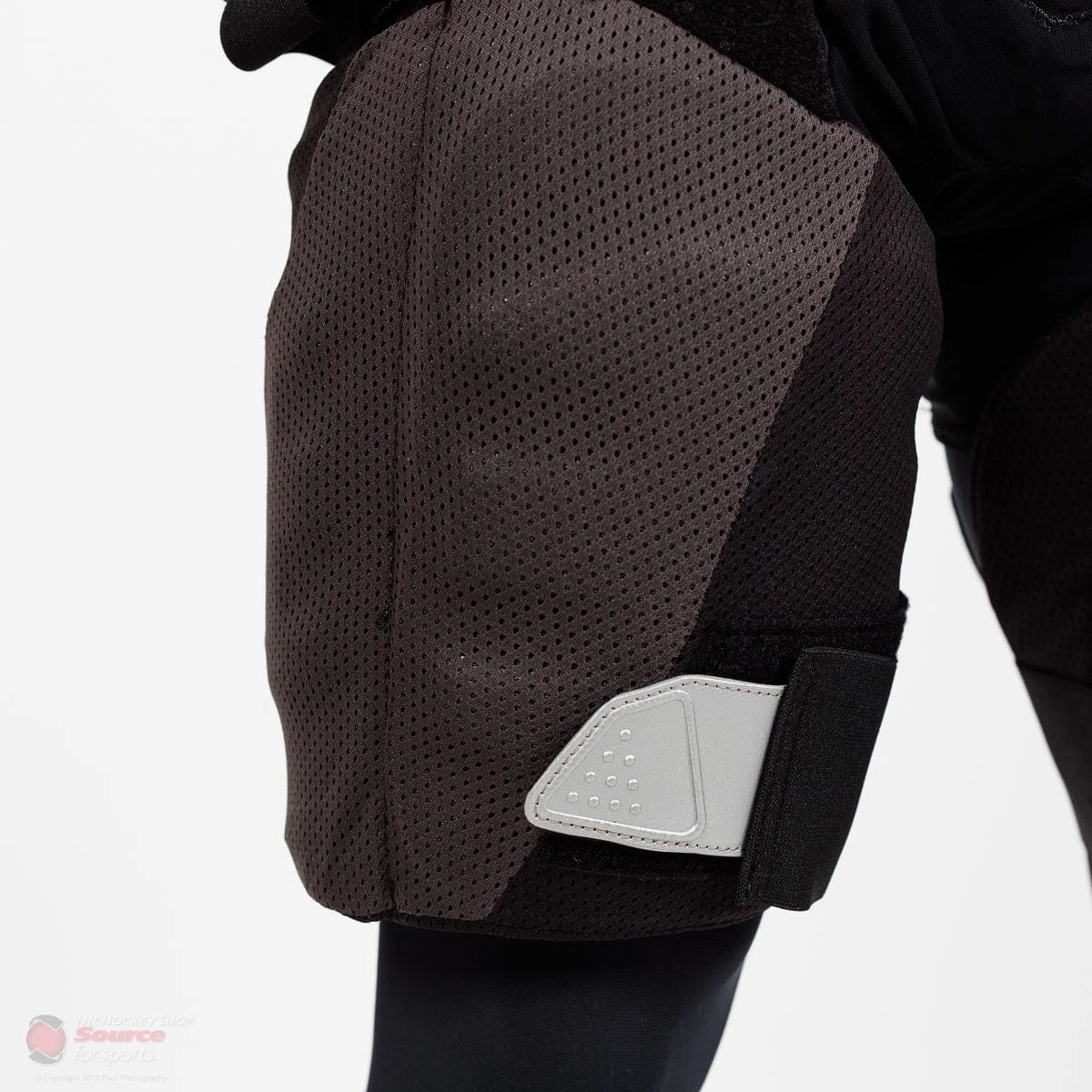 The CCM 9K Pro girdle features pro level protection. The HD foam and PE inserts segmented in the stretch Lycra base offers security in key areas of the body. The free-moving, JDP hip caps float against the hip at all times to better disperse impacts away from the joints. These caps are backed with HD foam as well to absorb more of the impacts. CCM also uses a two-piece Thigh guard backed with added slash protection to wrap around your leg. These pads are fastened with an elastic strap to enable you to adjust the pad tighter or looser around your leg based on your preference.