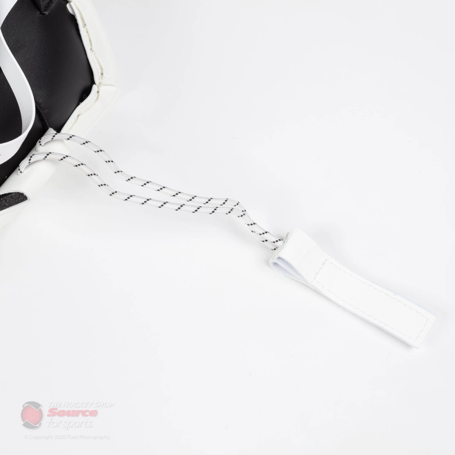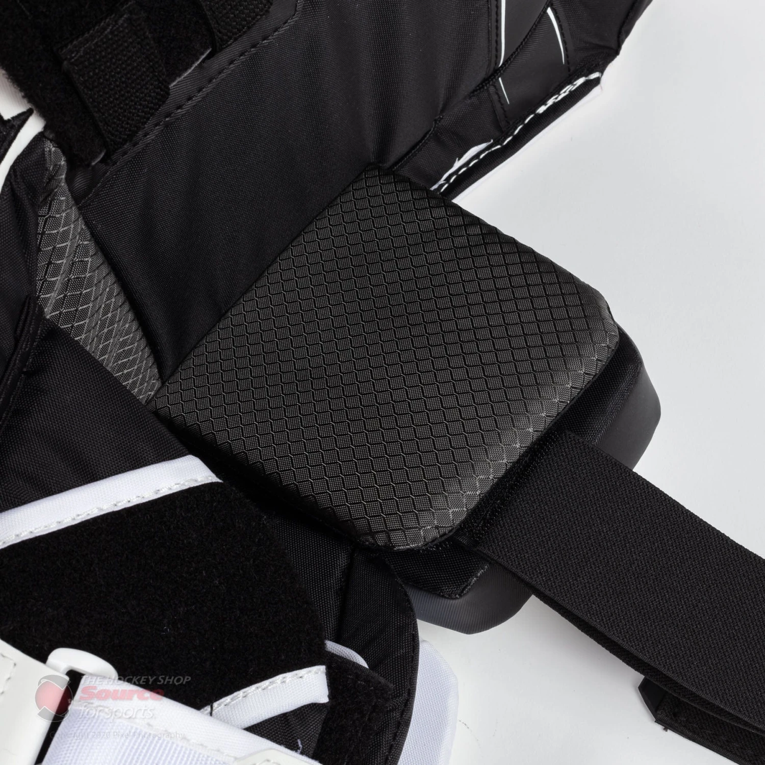 Velcro strapping has become very popular in the goalie world, and CCM is not lagging behind here. The QMSS system provides a familiar loose feel but is limited to 3 total velcro straps. The pad also features velcro bungee cords to limit hip strain as well as