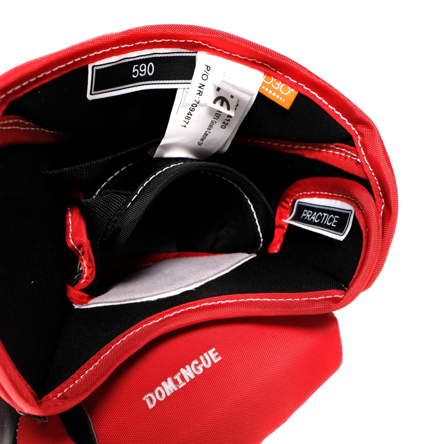 The mainly Jenpro exterior is a popular choice used by many goalies on their gear due to its lightweight feel and durability. The single tee offers greater puck feel while the puck enters the pocket of the glove. Rounding out this pro stock glove is the custom white “Domingue” embroidery on the inside of the cuff.Â