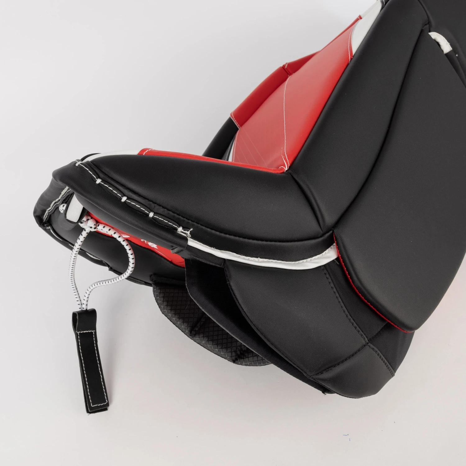 The pads use a 90-degree boot angle with a shallow channel for good balance and stability. The 90-degree boot angle allows the goalie to integrate their pads more effectively with the goal posts when in a butterfly position. By aligning the skate blade vertically, the goalie can achieve a better seal against the ice and the post, minimizing gaps and improving coverage. The pads also use a bungee toe system, which is an alternative to the traditional leather or nylon toe straps found on older-style leg pads. CCM’s bungee system is quick and secure and allows for more flexibility, easing the stress on goalies’ joints.