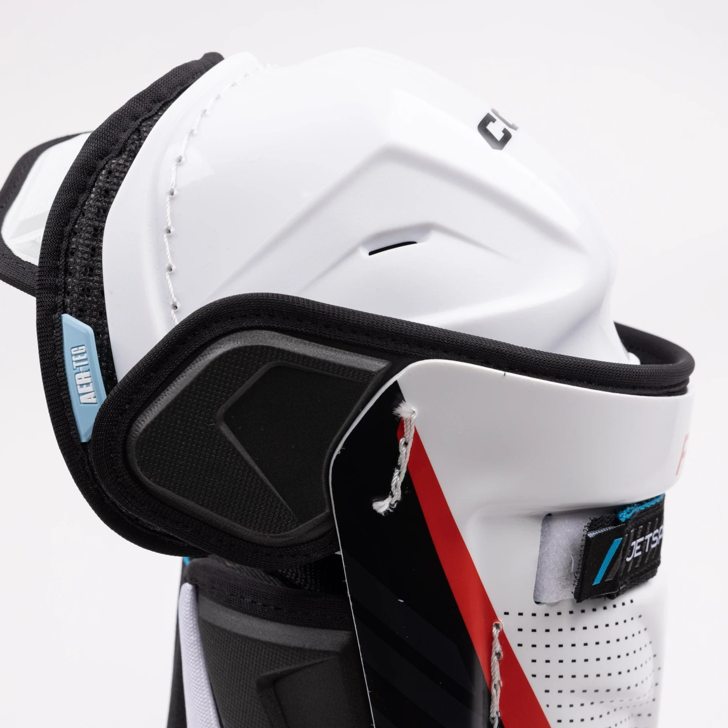 CCM debuts their new Aer-Tec Suspension and Thermoregulation technology, which includes a light nearly non-existent liner suspending the gear slightly away from the body for increased ventilation and to keep you feeling nice and cool while you play. The liner in the shin guards has been treated with Polygiene and Odor Crunch to keep them fresher for longer.