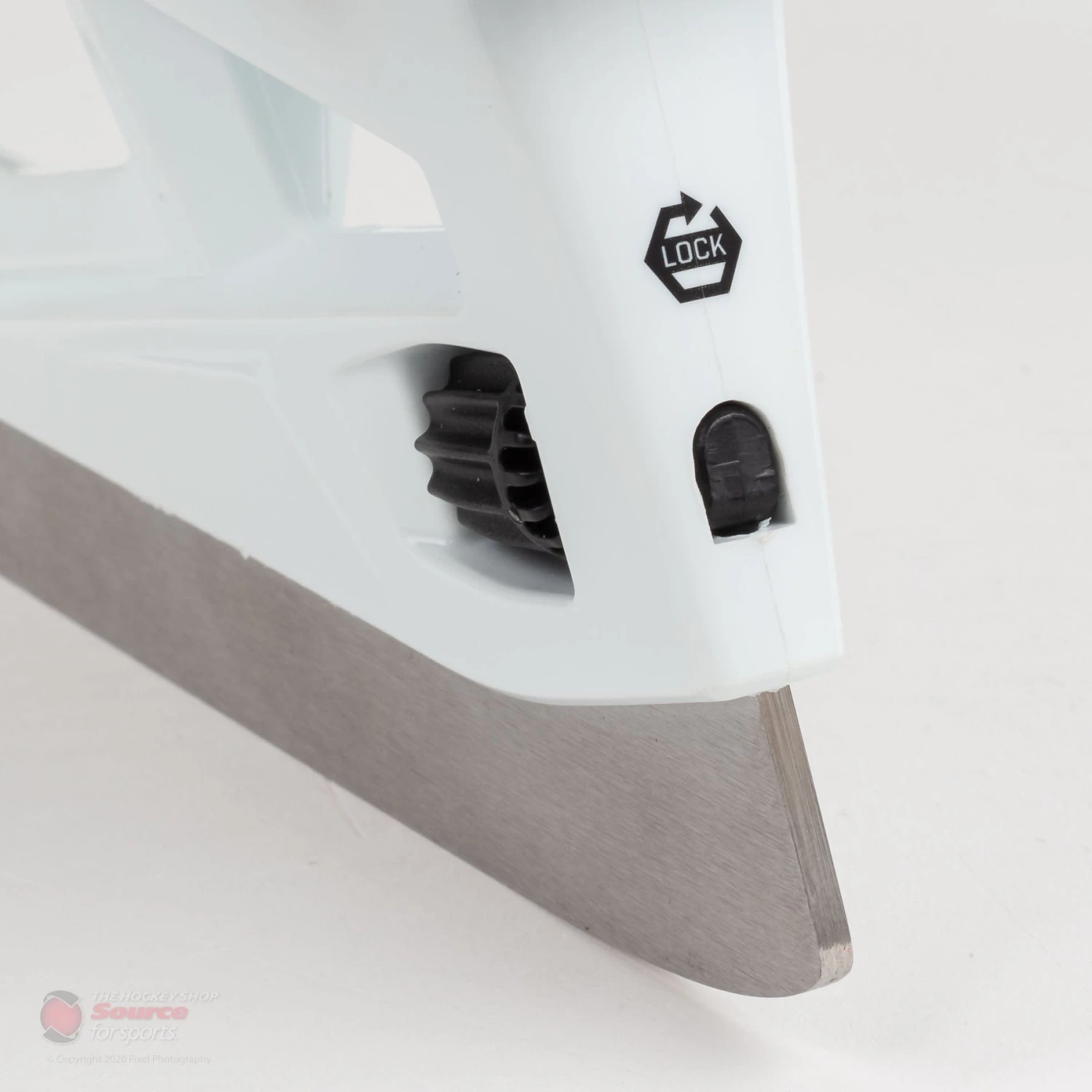 The CCM Super Tacks 9380 SR Goalie Skates are designed with the performance level goalie in mind. The 9380 goal skates feature a stiff MetaFrame boot construction built with CCM’s RocketFrame Composite, giving goalies a durable boot with increased structural stiffness. An asymmetrical collar allows goalies to get deep in their stance while a thermoformable core allows goalies to get a better fit than before. A TotalDri liner wicks moisture away while a Tritech flex tongue protects against lace bite, all while providing improved comfort. Ortholite insoles give goalies lightweight comfort while locking your feet into the skates. An XSG1 +2mm stainless steel runner gives the blades excellent edge life while sitting taller than previous generation CCM steel.